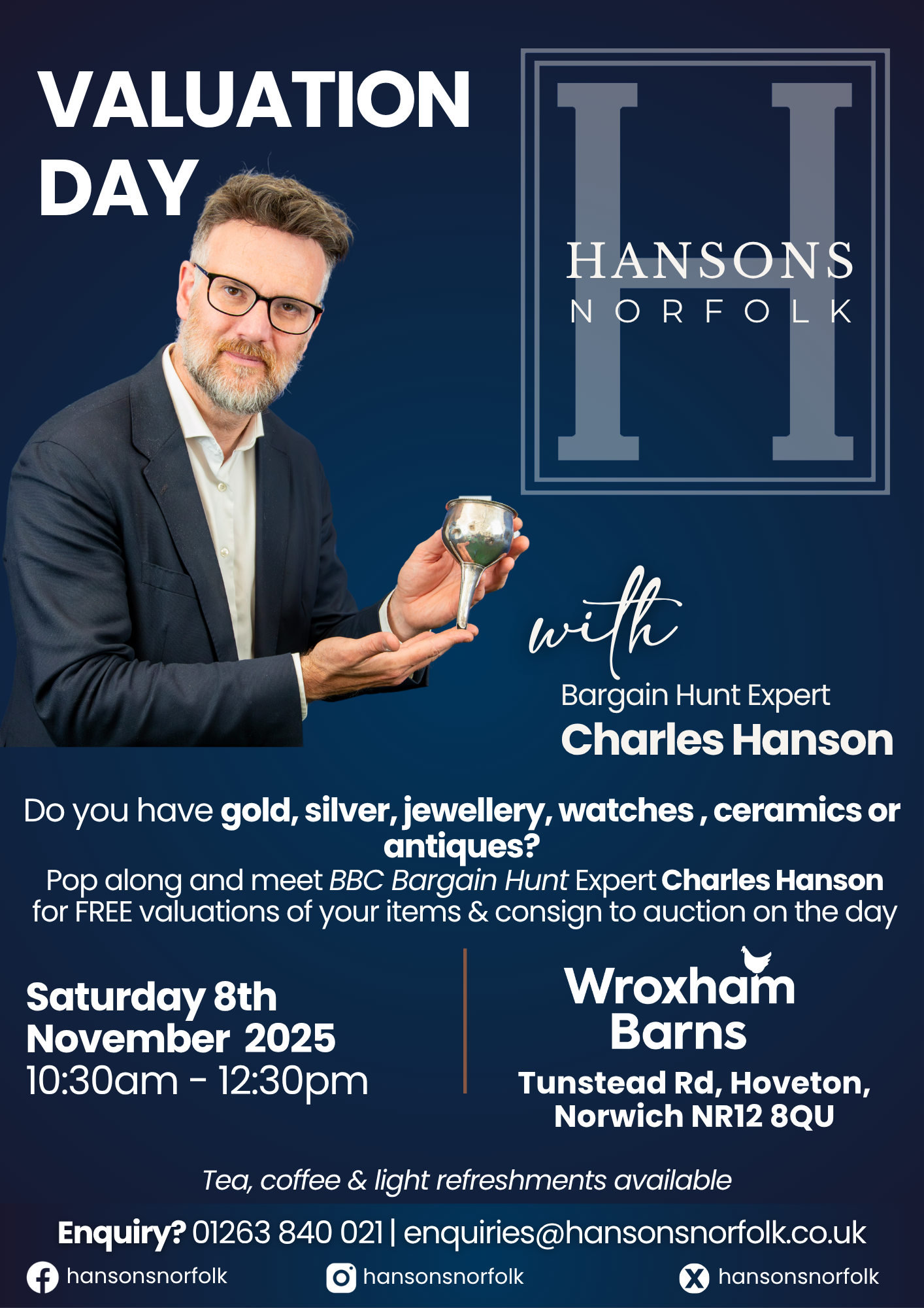Bring your gold, silver, jewellery, ceramics, or antiques to Wroxham Barns for a free valuation with TV’s Charles Hanson from Bargain Hunt!